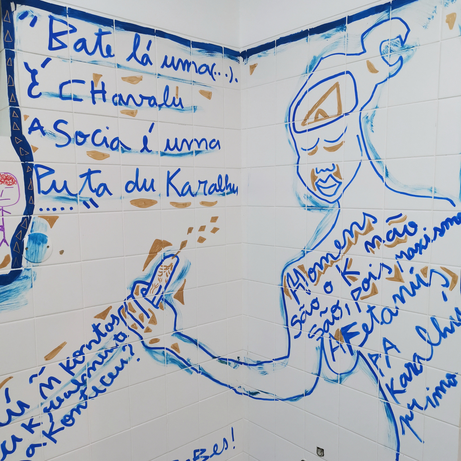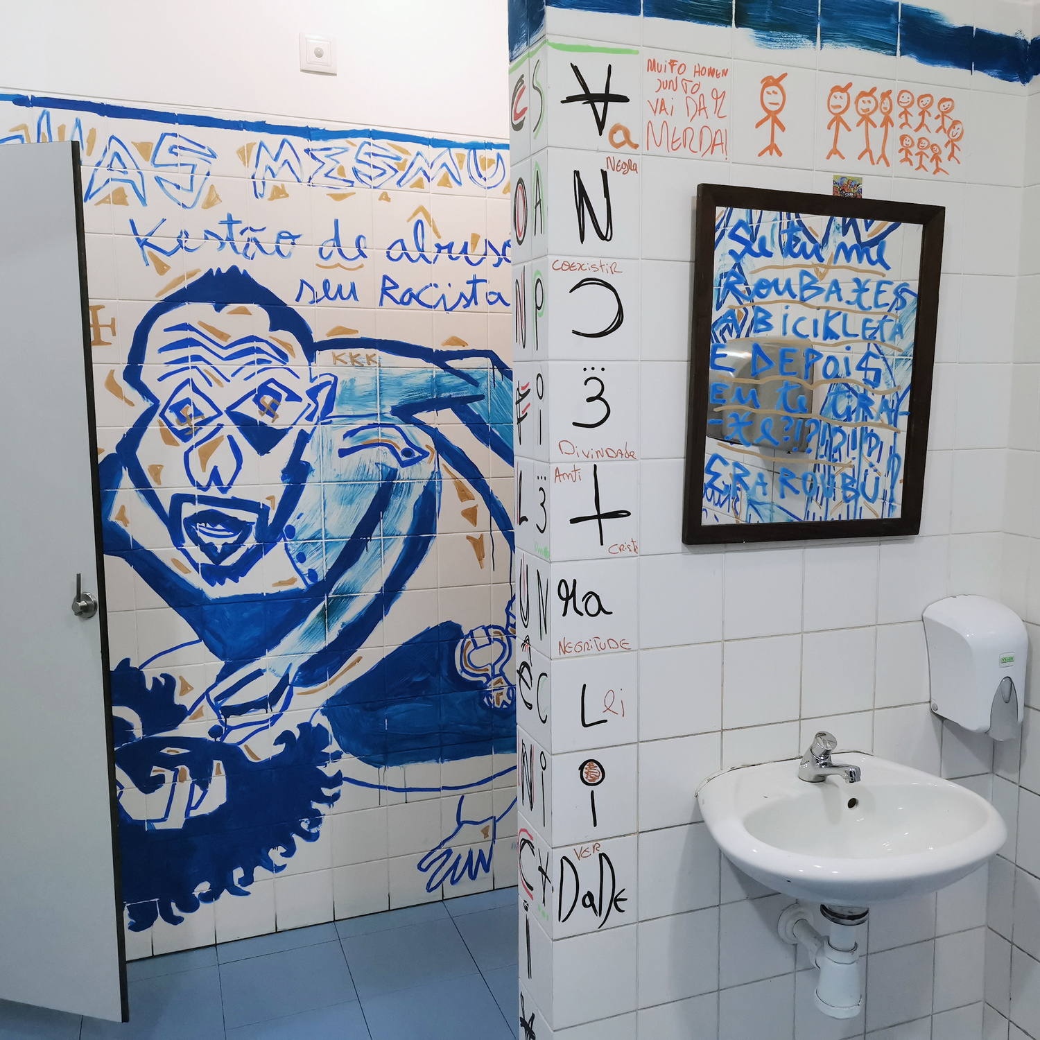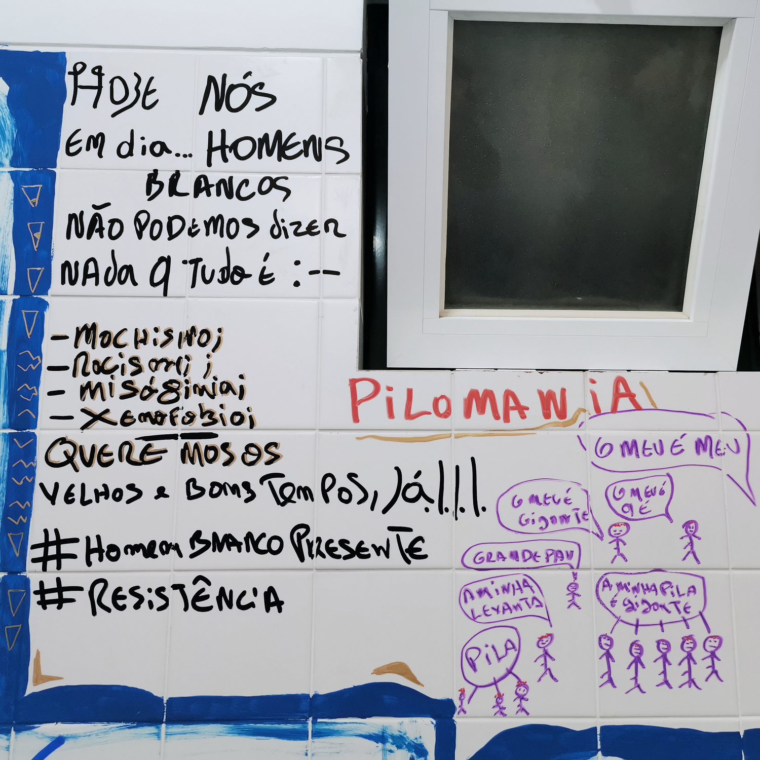 As do Micro Clima não seguem essa “regra” e daí iniciarmos este texto por elas. O artista Rappepa Bedjo Tempo teve carta branca para fazer com os azulejos vazios dos quatro WCs do festival o que quisesse e o resultado não poderia ser melhor, seguindo a onda do que apresenta no seu Instagram. Nas paredes de uma das casas-de-banho, por exemplo, havia dicas sobre a masculinidade tóxica e apontamentos sobre racismo, escritos e desenhados com classe artística mas na linguagem de tags que costumamos ver nesses espaços públicos. Uma surpresa para quem só ia lá porque o corpo obrigava mas sentiu-se na necessidade de sacar do telemóvel e a fazer aquela foto para as Stories.