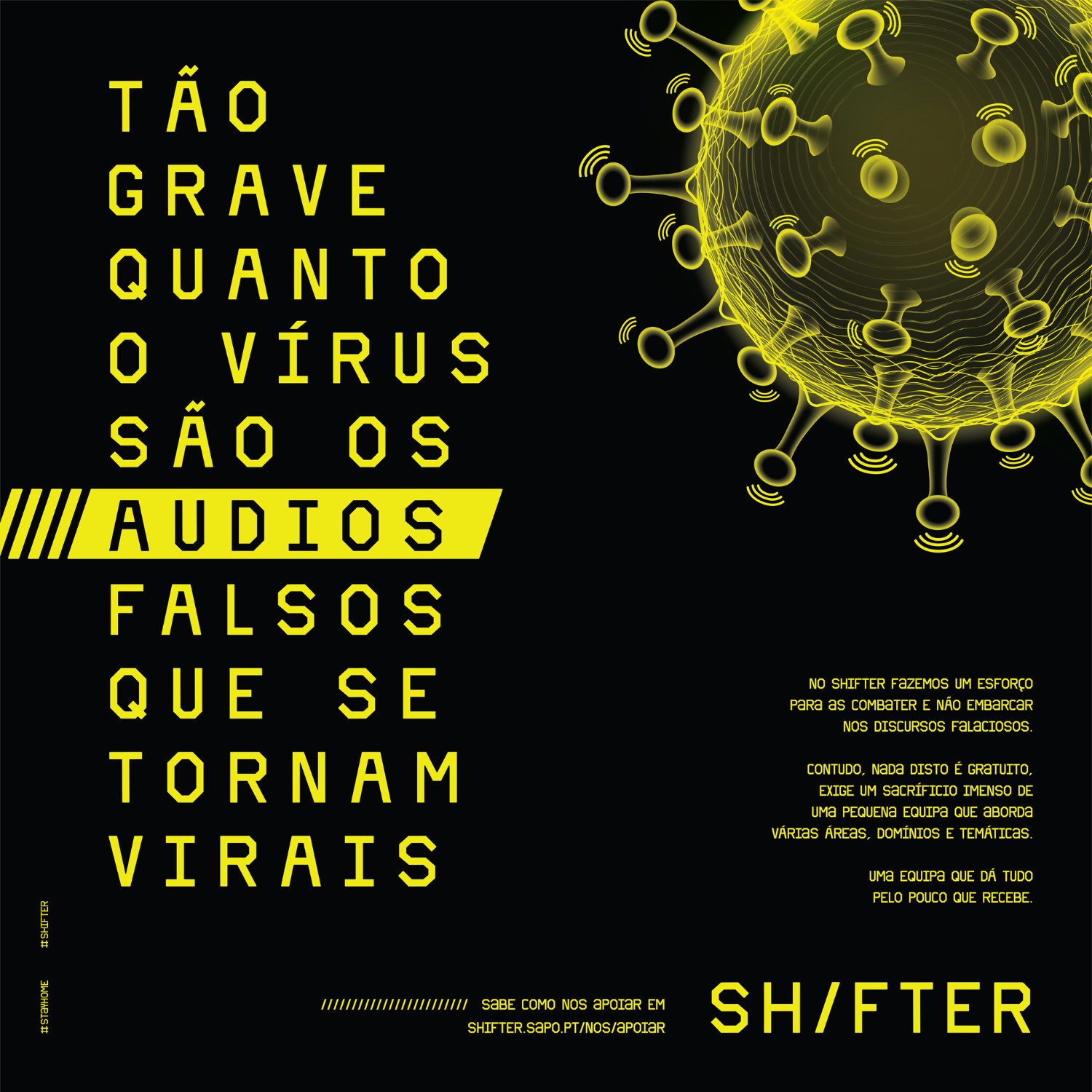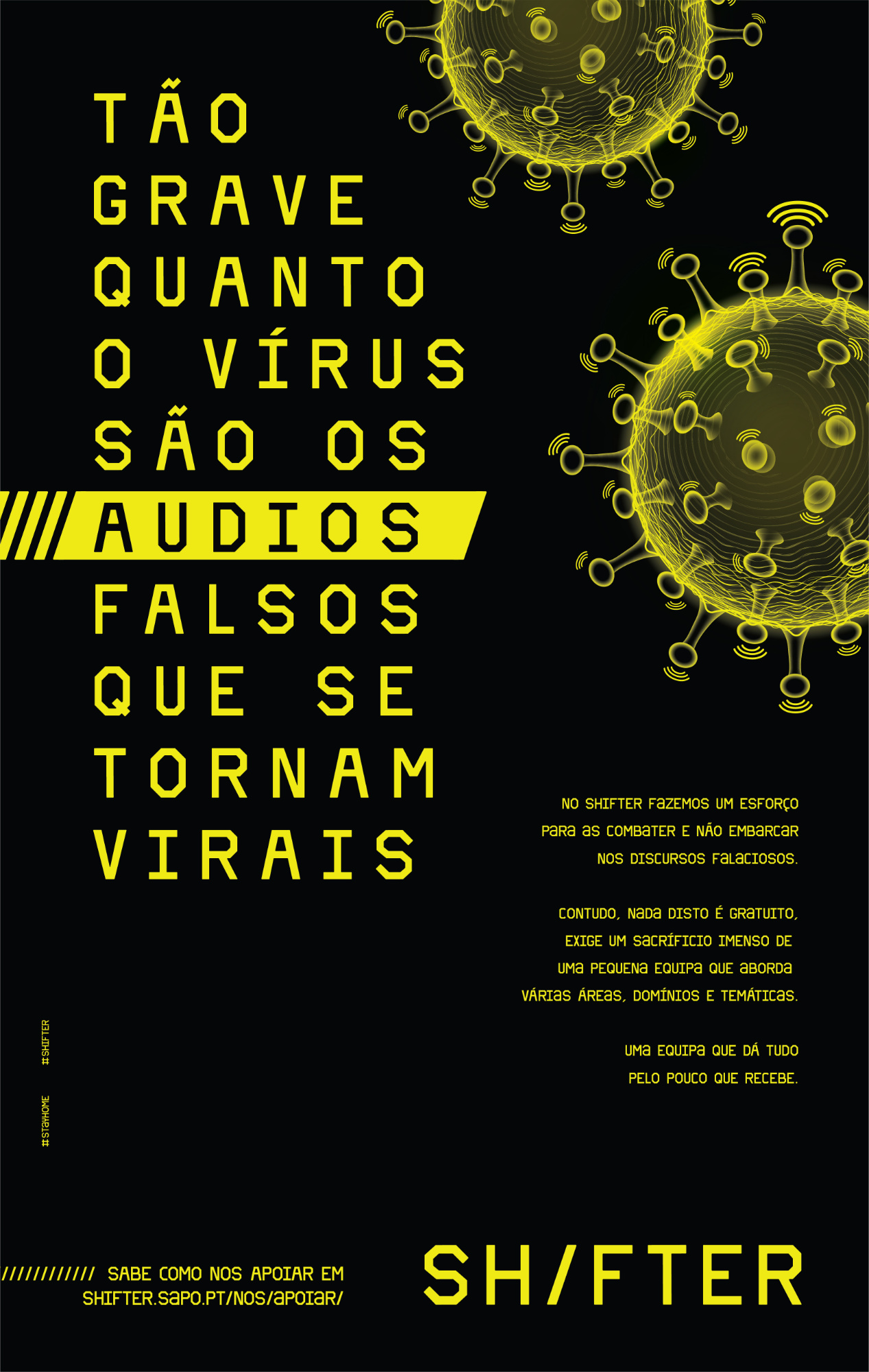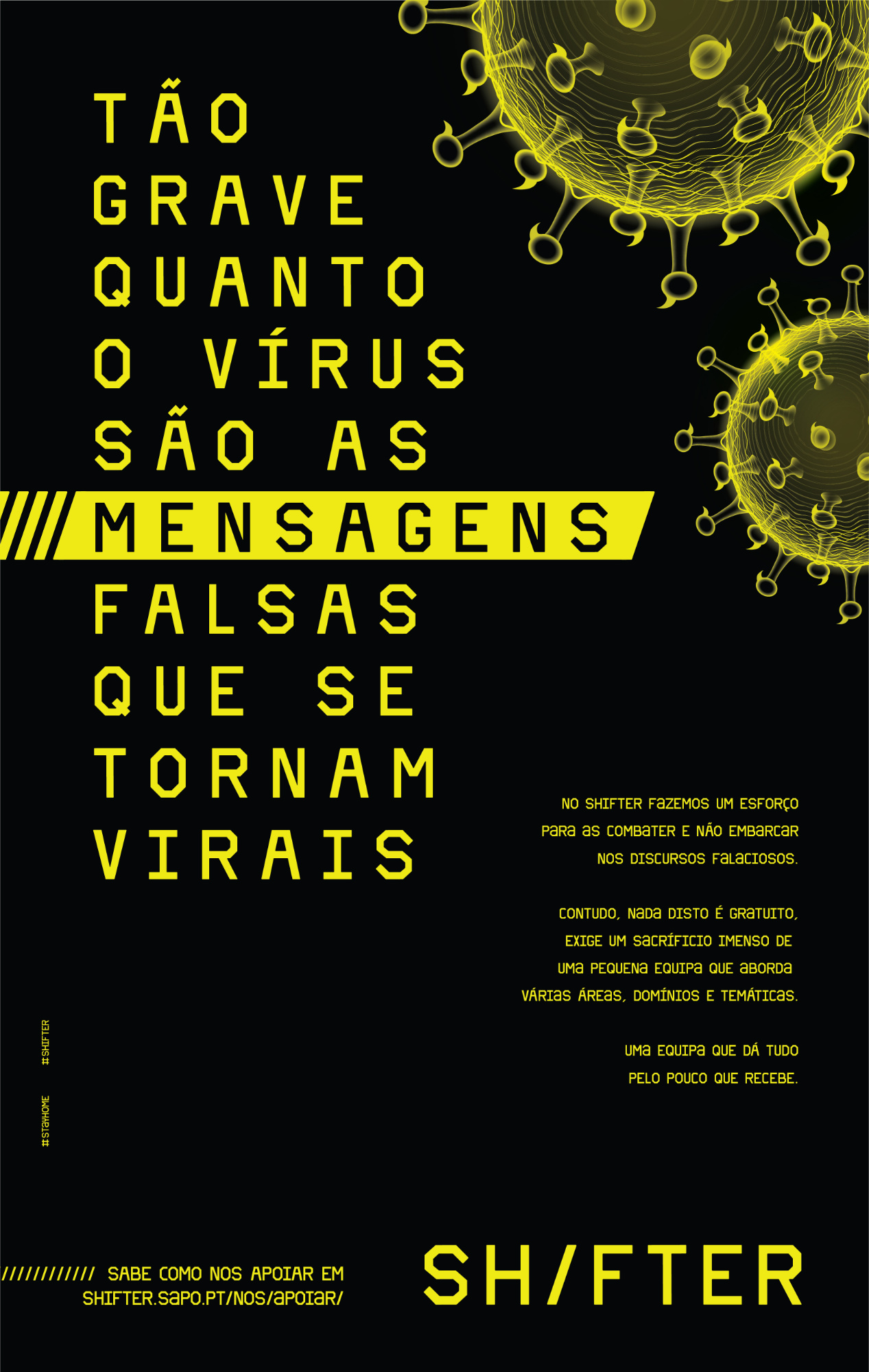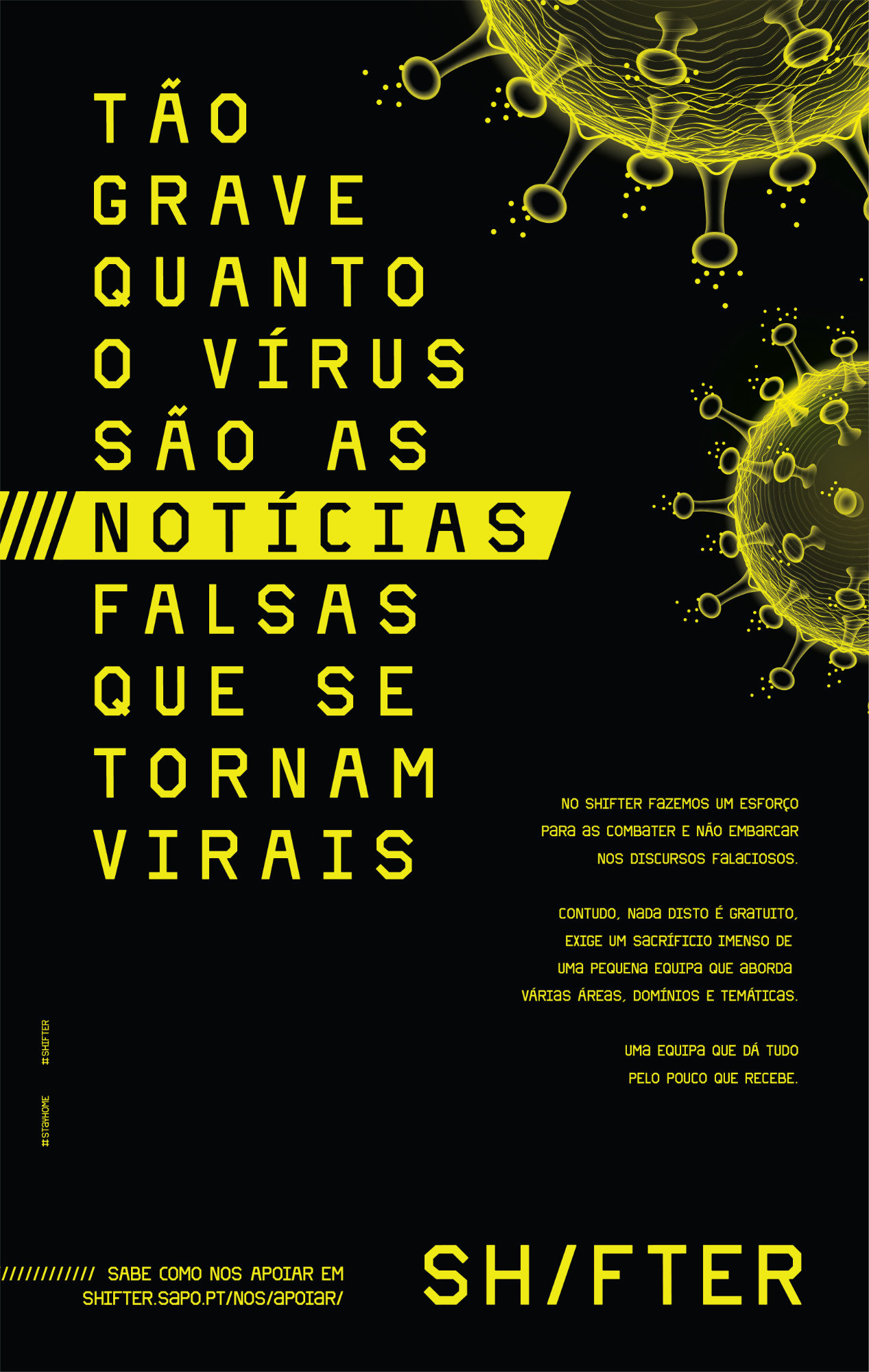 Inspirado por uma frase que o João partilhou numa publicação no Linkedin – “a desinformação é uma epidemia tão perigosa quanto a do novo coronavírus” –, o António Duarte e o amigo Ulisses Silva desenharam espontaneamente uma campanha publicitária para o Shifter, numa altura em que, nas suas palavras, “o verdadeiro conteúdo e as notícias de fontes credíveis deviam estar acima de tudo quando se trata de informação”.