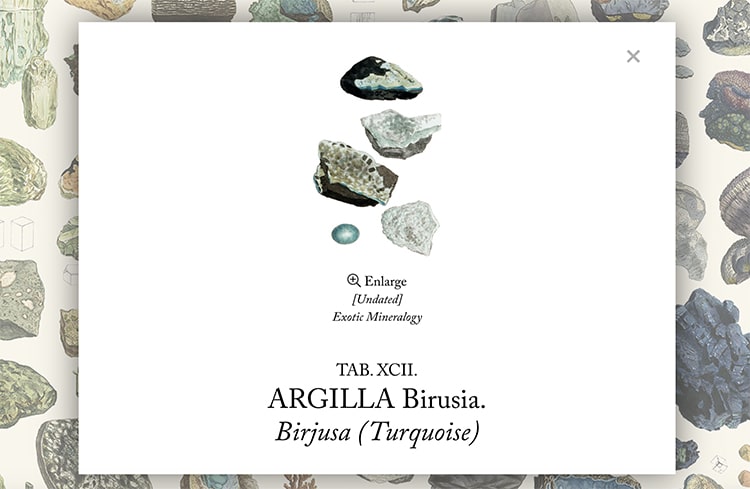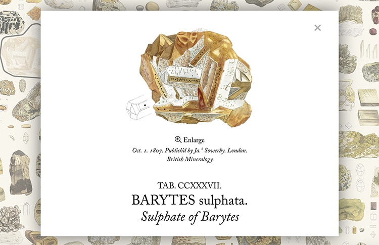 A experiência final permite que os utilizadores satisfaçam a sua curiosidade sobre o tema, como se de um museu temático se tratasse. Podes clicar numa amostra, e uma ilustração ampliada aparecerá, com o nome e descrição do mineral em questão, e podes ainda consultar um índice muito útil para aspirantes a geólogos. O projeto de Rougeux usa a estética elegante do design moderno da web para dar vida ao trabalho de Sowerby, 200 anos depois da sua publicação inicial – British & Exotic Mineralogy é uma experiência imersiva que reúne geologia, história, ilustração e design, que liga o presente ao passado, com a mesma perícia e detalhe, dois séculos depois. A ilustração final pode ainda ser encomendada em formato póster, com vários tamanhos e preços.