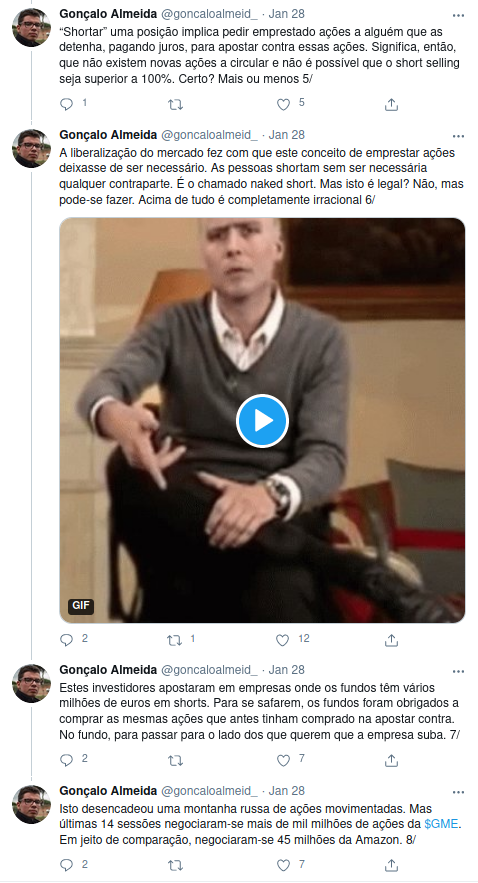 Como pudemos ver até aqui, o momento GameStop foi – alinhando na fórmula descritiva mais comum – como se o mundo da alta finança encontrasse o mundo das redes sociais. Um pouco à imagem do que aconteceu noutros domínios, como a política, a promessa de que os pequenos saíriam empoderados pelas aplicações tecnológicas foi mais uma vez o móbil da união e crescimento exponencial e comunidades. Desta feita, não em nome de um ideal político mas em nome de dinheiro fácil. Rogério Casanova, escreve no DN uma interessante (e divertida) comparação entre os fenómeos (político e agora financeiro). Os resultados, contudo, não foram substancialmente diferentes, sobretudo na sua interpretação dos fenómenos – embora no caso político se tenha demorado mais a revelar o lado pernicioso das redes sociais, em escandalos como o Cambridge Analytica.