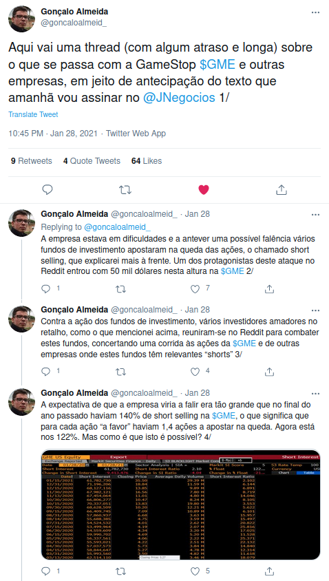 Se é certo que a disrupção que se testemunhou permitiu a alguns investidores do retalho — comuns mortais — lucrar quantias avultadas num curto espaço de tempo, ainda é mais certo que nem todos tiveram a mesma sorte e que não é sobre estes que deve rezar a história. Para perceber tudo o que se passou é preciso cruzar informações de vária dimensões, numa sequência lógica que vai desde o conceito de shorting, até às apps de daytrading, e à velhinha GameStop, passando por fundos de cobertura e pelos recantos do reddit, à boleia de memes, tweets, threads, à boa moda da internet.