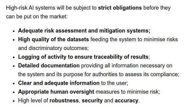 Por exemplo, segundo o rascunho da proposta, as utilizações de Inteligência Artificial que possam ter impacto na vida das pessoas ou das sociedades (como análise de risco para seguros ou processos de recrutamento) são consideradas “arriscadas” e estão sujeitas ao cumprimentos de normas que visam assegurar a qualidade dos dados, a documentação dos processos, o cumprimento das normas europeias, transparência dos sistemas e supervisão humana. Para além disto, sobre outros usos, estabelece-se que, genericamente, os utilizadores devem ser relembrados quando estiveram a interagir com inteligência artificial, seja sob a forma de bots conversacionais, deepfakes ou outras utilizações da I.A..