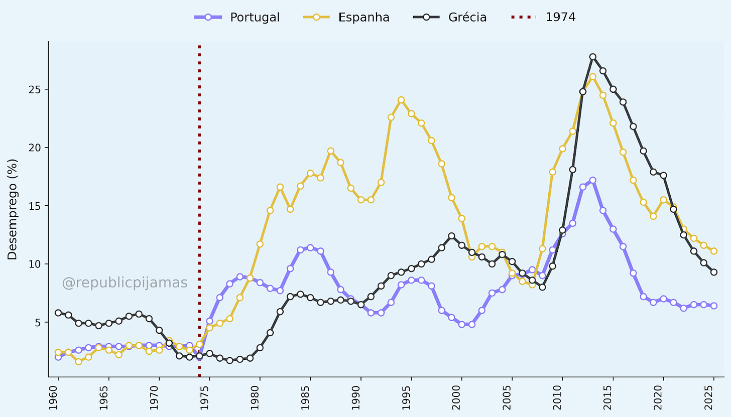 Ainda assim, a comparação da taxa de desemprego com Espanha ainda peca por não capturar a dimensão do desafio imediato após o 25 de Abril. Com o “retorno” de centenas de milhares de portugueses de África, o desemprego dispara nos primeiros anos de democracia, para a casa dos 7-9%. Com isto, é dissimulado o facto de a economia nacional ter criado praticamente meio milhão de empregos em 1973 e 1976. Assim, faz-se uma transição de uma ditadura a combater a guerra colonial para uma democracia com um estado social em expansão.