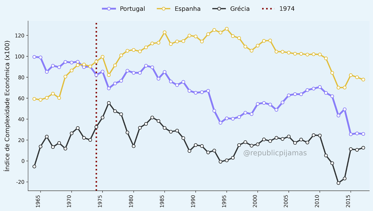 Esta hipótese é suportada pelo índice de complexidade económica – uma métrica que estima as capacidades produtivas de um país através das vantagens competitivas internacionais.Não existe qualquer indício de uma rutura abrupta da complexidade exportadora nacional no Portugal democrático, apenas a continuação de uma longa e gradual tendência de declínio face a Espanha. Os grandes choques negativos na complexidade das exportações nacionais deram-se no início da década de 1990, por volta da assinatura do Tratado de Maastricht, e posteriormente, depois da crise financeira. Nenhum destes momentos aparece nas narrações que vão surgindo à direita.