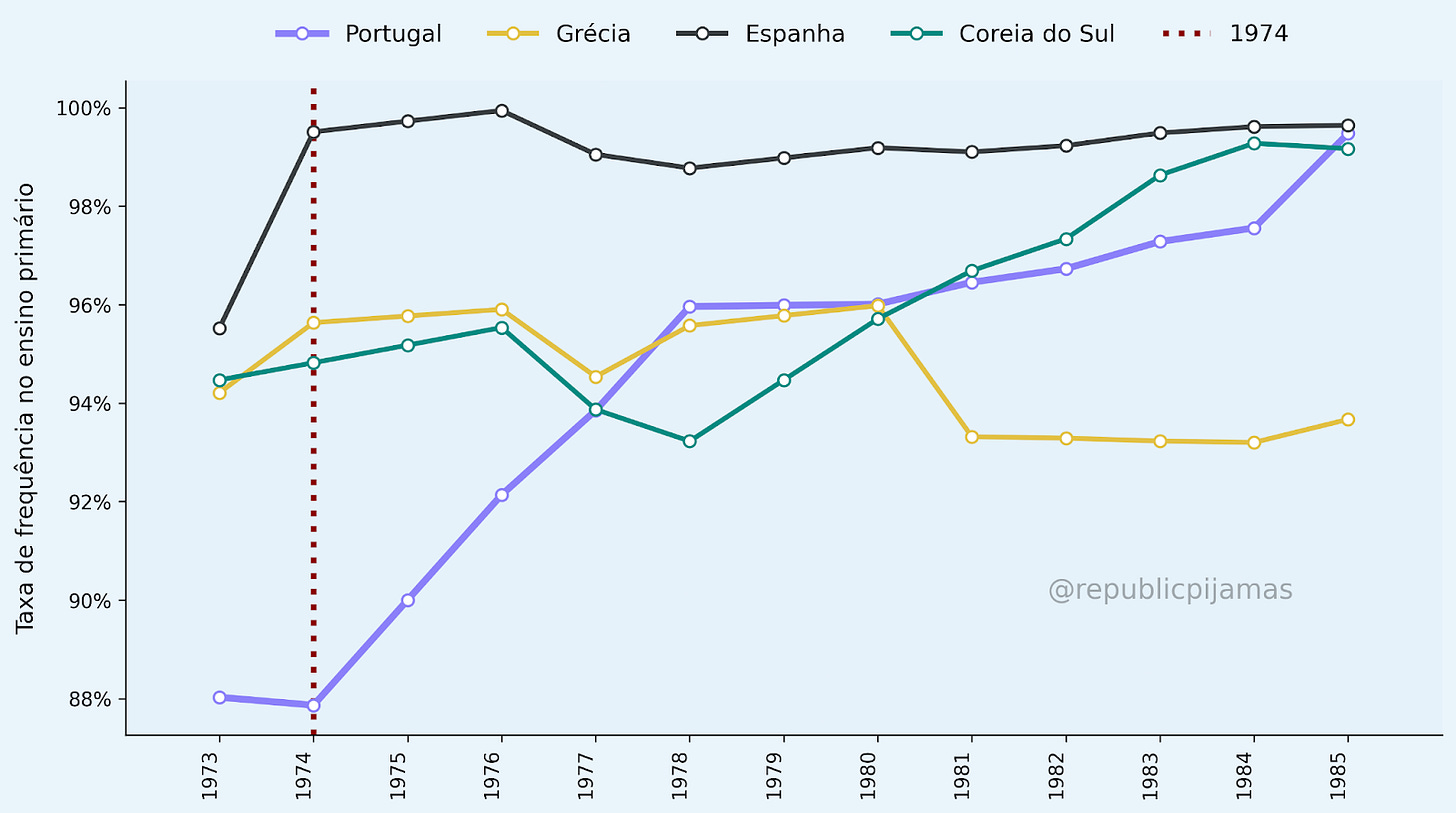Na educação, Portugal deixa de estar na cauda e finalmente converge no que diz respeito à frequência na educação primária. Estes progressos devem ser vistos além dos números, e contextualizados no contexto revolucionário português.