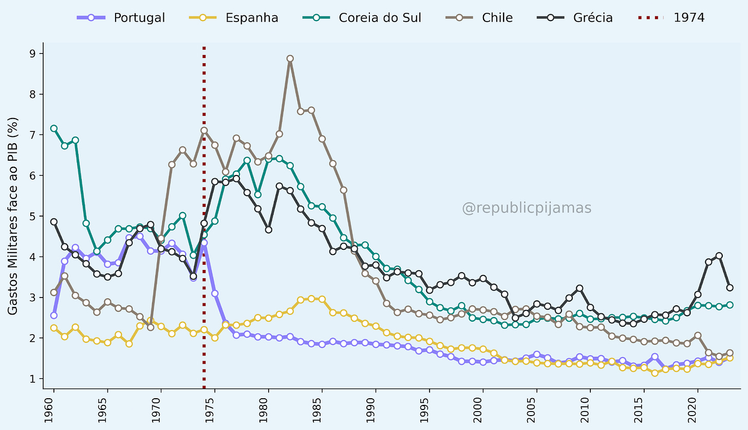 A ruptura revolucionária faz um corte nas despesas militares que não é visto em Espanha, no Chile, na Grécia ou na Coreia do Sul. Estes países têm contextos diferentes (em especial a Grécia e a Coreia do Sul) mas mostram que uma transição negociada com regimes em que os militares têm poder deixa um lastro. A revolução cria um dividendo da paz duradouro, que dificilmente surgiria numa negociação de bastidores entre altas patentes e as lideranças do Estado Novo. Com uma face política em António de Spínola, devido à guerra, estas detinham uma enorme fatia do orçamento do Estado, da qual dificilmente teriam aberto a mão sem contrapartidas. No caso chileno, Augusto Pinochet consegue manter-se como o mais alto responsável pelas Forças Armadas até 1998, quando passou a ser um senador vitalício, um cargo feito à medida.