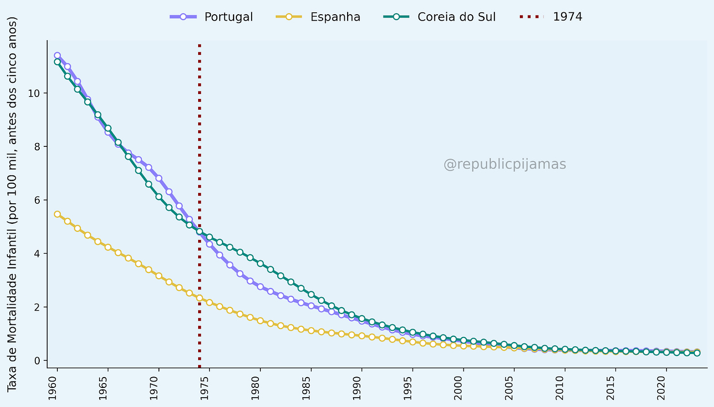 Na década de 1960 ate antes do 25 de Abril, Portugal tem uma queda da mortalidade infantil menos impressionante que a Coreia do Sul para o mesmo período, ou que Espanha no período que tinha valores comparáveis (pós-segunda guerra). Depois da revolução, a situação inverte-se a favor de Portugal. Fonte: Our World in Data.