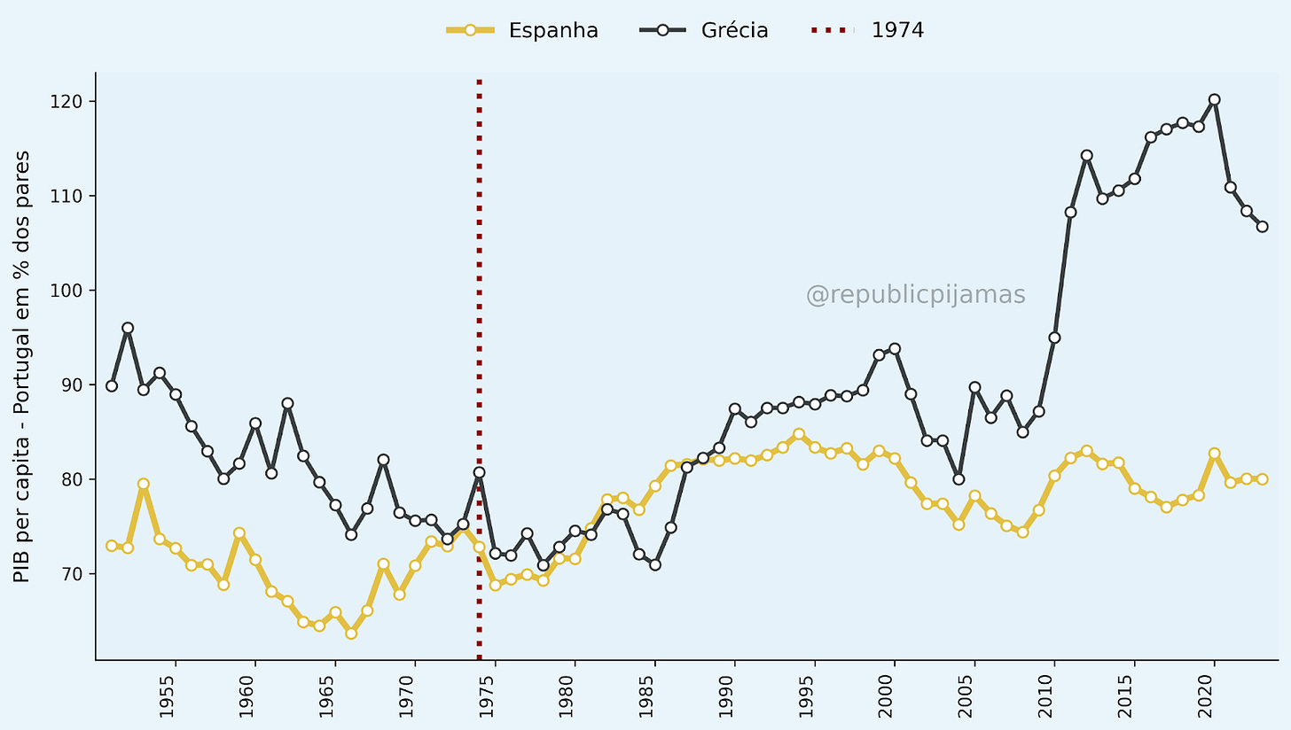 Apesar de algumas flutuações, o rendimento por habitante entre Portugal e Espanha é estável nos anos anteriores e posteriores à revolução. Apesar da queda temporária em 1974-75, não há qualquer indício de uma divergência estrutural na economia nacional causada pela revolução. No limite, é mais fácil argumentar que houve uma melhoria face a Espanha nos anos posteriores à revolução, sensivelmente até ao Tratado de Maastricht. Podem ser retiradas conclusões muito semelhantes quando o mesmo exercício é feito com a Grécia.