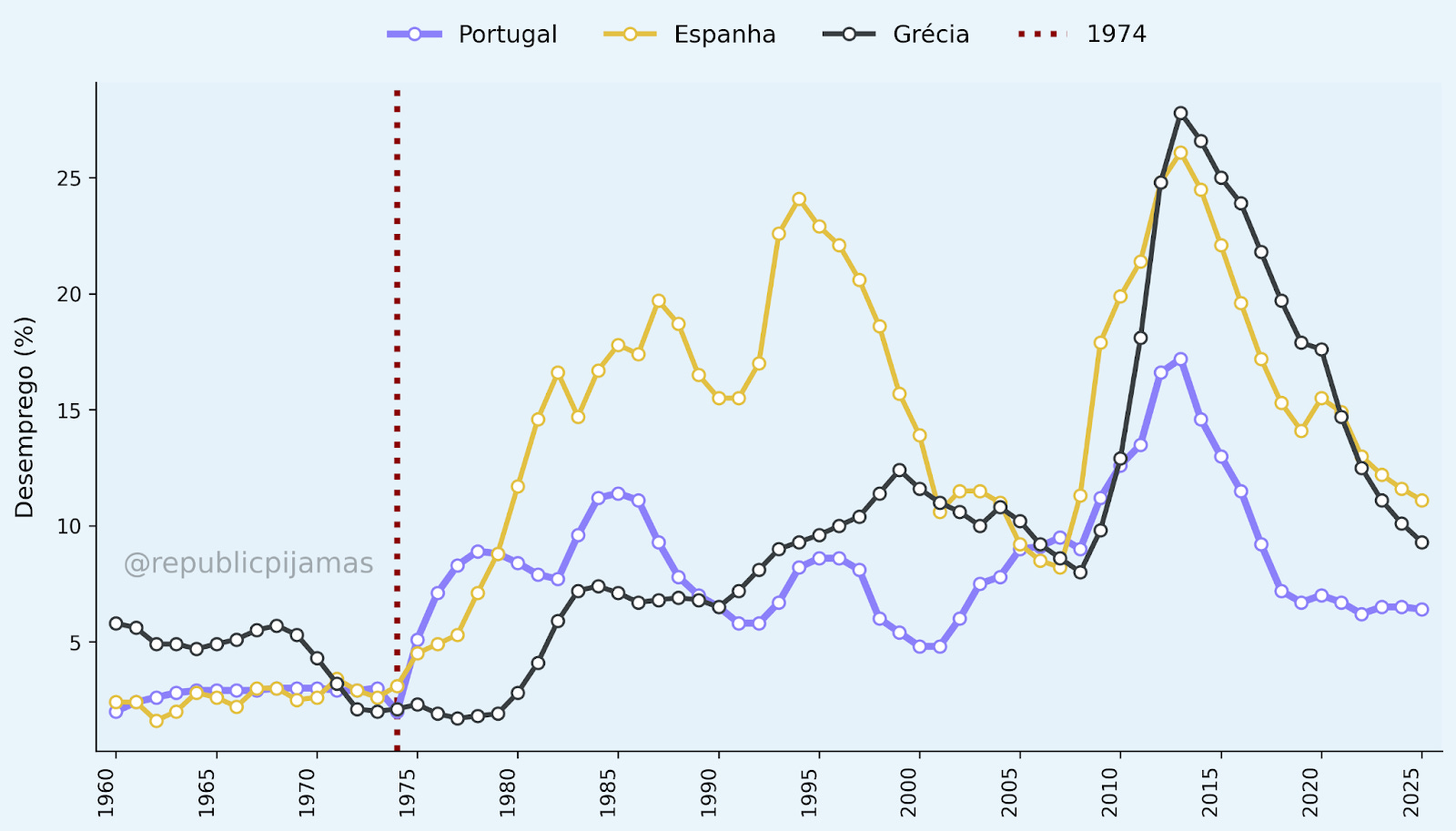 As diferenças de crescimento entre a produtividade e o PIB per capita não são uma tecnicidade abstrata ou uma métrica instrumental para refutar a tese de pensadores da direita. A grande divergência entre os dois indicadores é a evolução do emprego. Sobretudo, demonstra que Portugal tem uma outra divergência estrutural face a Espanha, mas dessa vez favorável ao nosso país. Enquanto o desemprego entre Portugal e Espanha era semelhante entre os anos 1960 e 1975, a economia espanhola viu o desemprego disparar no final da década de 1970. No país vizinho, perdem-se centenas de milhares de empregos durante um ciclo de crescimento. Assim, os nossos vizinhos passam a ter taxas de desemprego cronicamente nos dois dígitos, estruturalmente muito mais altas que as portuguesas.