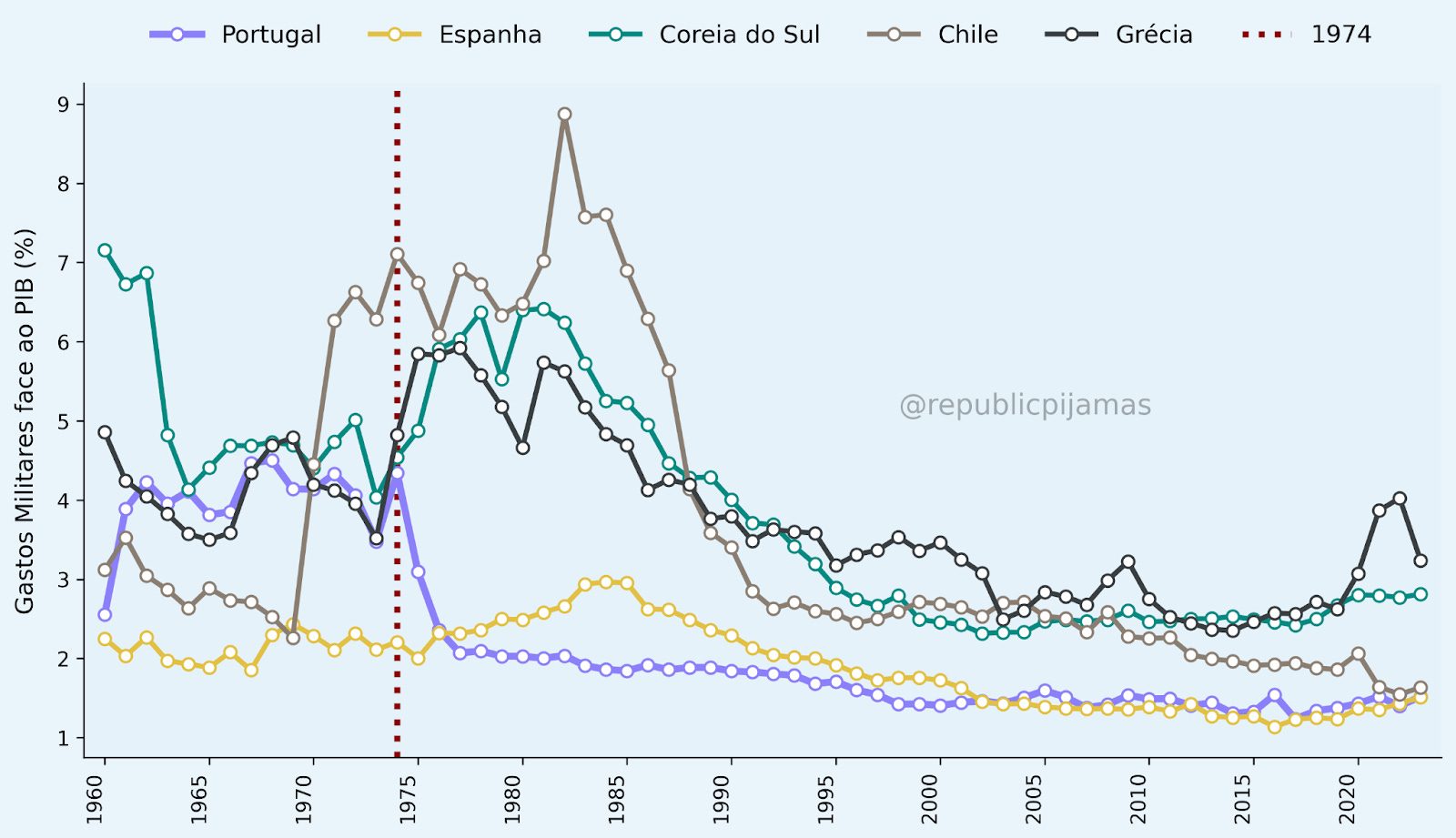 A ruptura revolucionária faz um corte nas despesas militares que não é visto em Espanha, no Chile, na Grécia ou na Coreia do Sul. Estes países têm contextos diferentes (em especial a Grécia e a Coreia do Sul) mas mostram que uma transição negociada com regimes em que os militares têm poder deixa um lastro. A revolução cria um dividendo da paz duradouro, que dificilmente surgiria numa negociação de bastidores entre altas patentes e as lideranças do Estado Novo. Com uma face política em António de Spínola, devido à guerra, estas detinham uma enorme fatia do orçamento do Estado, da qual dificilmente teriam aberto a mão sem contrapartidas. No caso chileno, Augusto Pinochet consegue manter-se como o mais alto responsável pelas Forças Armadas até 1998, quando passou a ser um senador vitalício, um cargo feito à medida.