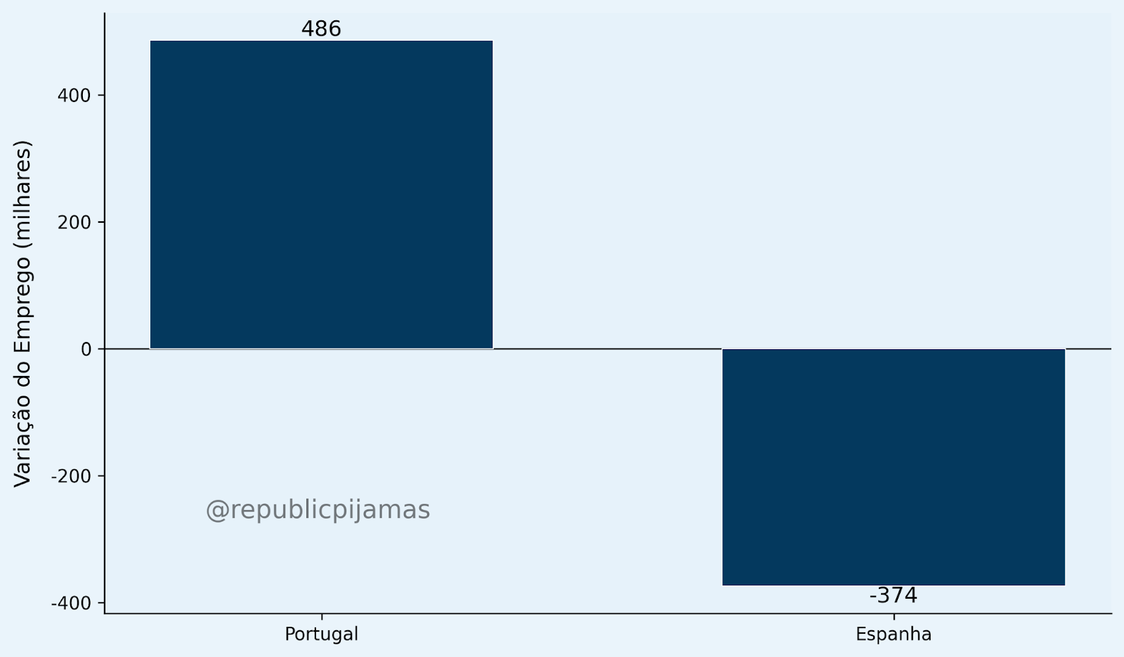 Ainda assim, a comparação da taxa de desemprego com Espanha ainda peca por não capturar a dimensão do desafio imediato após o 25 de Abril. Com o “retorno” de centenas de milhares de portugueses de África, o desemprego dispara nos primeiros anos de democracia, para a casa dos 7-9%. Com isto, é dissimulado o facto de a economia nacional ter criado praticamente meio milhão de empregos em 1973 e 1976. Assim, faz-se uma transição de uma ditadura a combater a guerra colonial para uma democracia com um estado social em expansão.