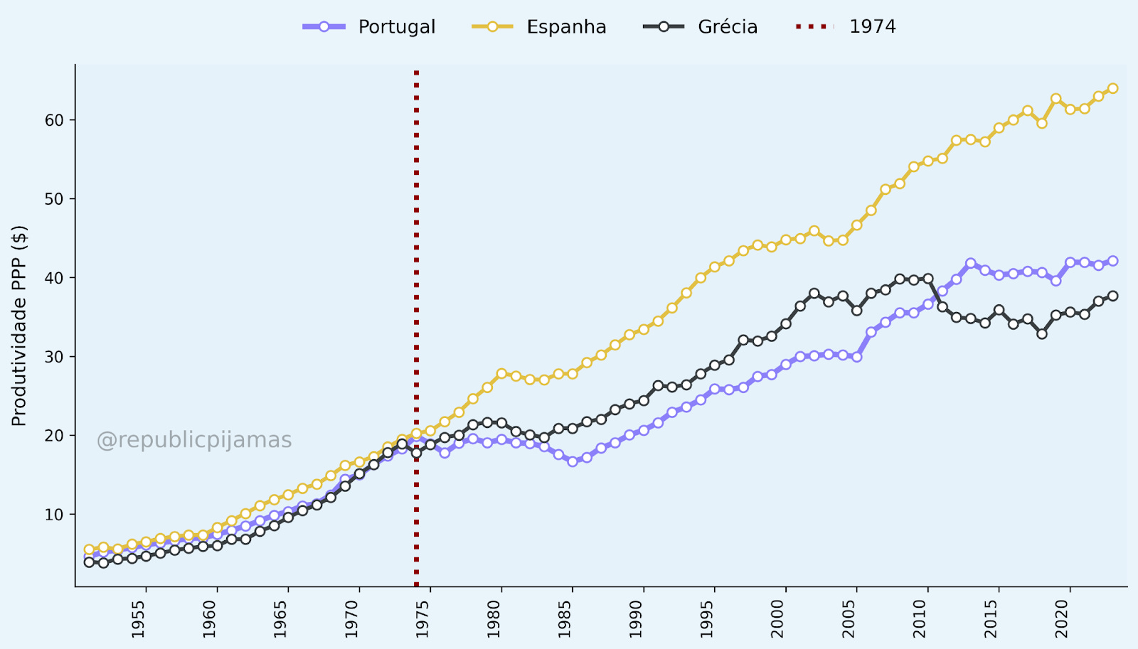 A produtividade por hora de Espanha diverge com Portugal desde 1974. O facto de divergir em simultâneo com a Grécia é motivo suficiente para tentar entender melhor as dinâmicas desta tendência. Fonte: Our World in Data.