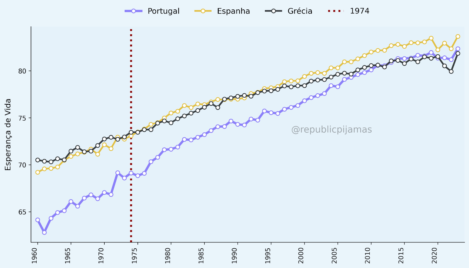 Com a revolução, a esperança de vida melhora a um ritmo superior ao visto na Grécia quando tinha níveis semelhantes e converge com o ritmo espanhol. Fonte: Our World in Data.
